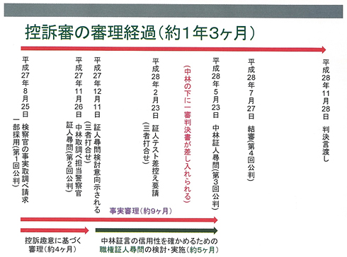 明らかに一審の検察官の立証方法は、従来の一般的な供述の信用性の主張です。合理的、関係証拠の符合ということだけでは不十分だ、それぐらい中林供述は、経過からしても、もともと怪しいわけです。取引も疑われる。意図的な供述で疑われるような状況にあるから、こういう間接事実による推認とか、虚偽供述が論理的に否定できるという主張をしないと、なかなか覆せないという判断で、このような主張をしてきたと考えられます。これが控訴審の審理経過です。 |